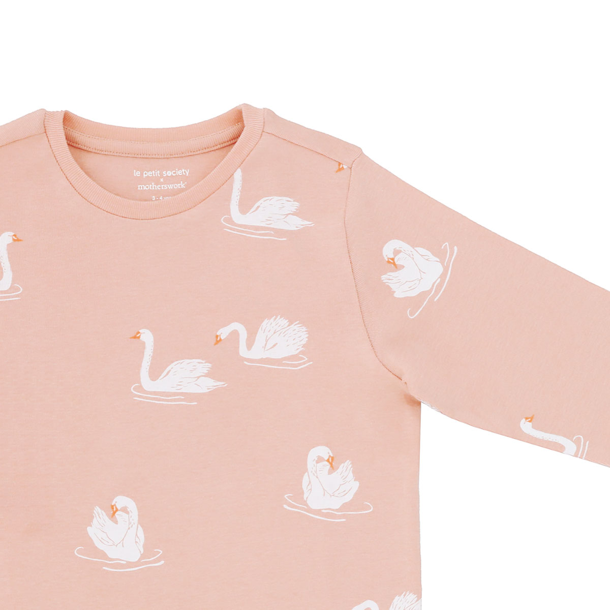 [8 Sizes] Motherswork x Le Petit Society Kids Unisex Soft Organic Cotton Long Sleeve Pyjamas Set (Shirt + Pants) 2Y+ - Peach Swan Print | pyjamas for kids girls / kids pyjamas boys / baby pyjamas set