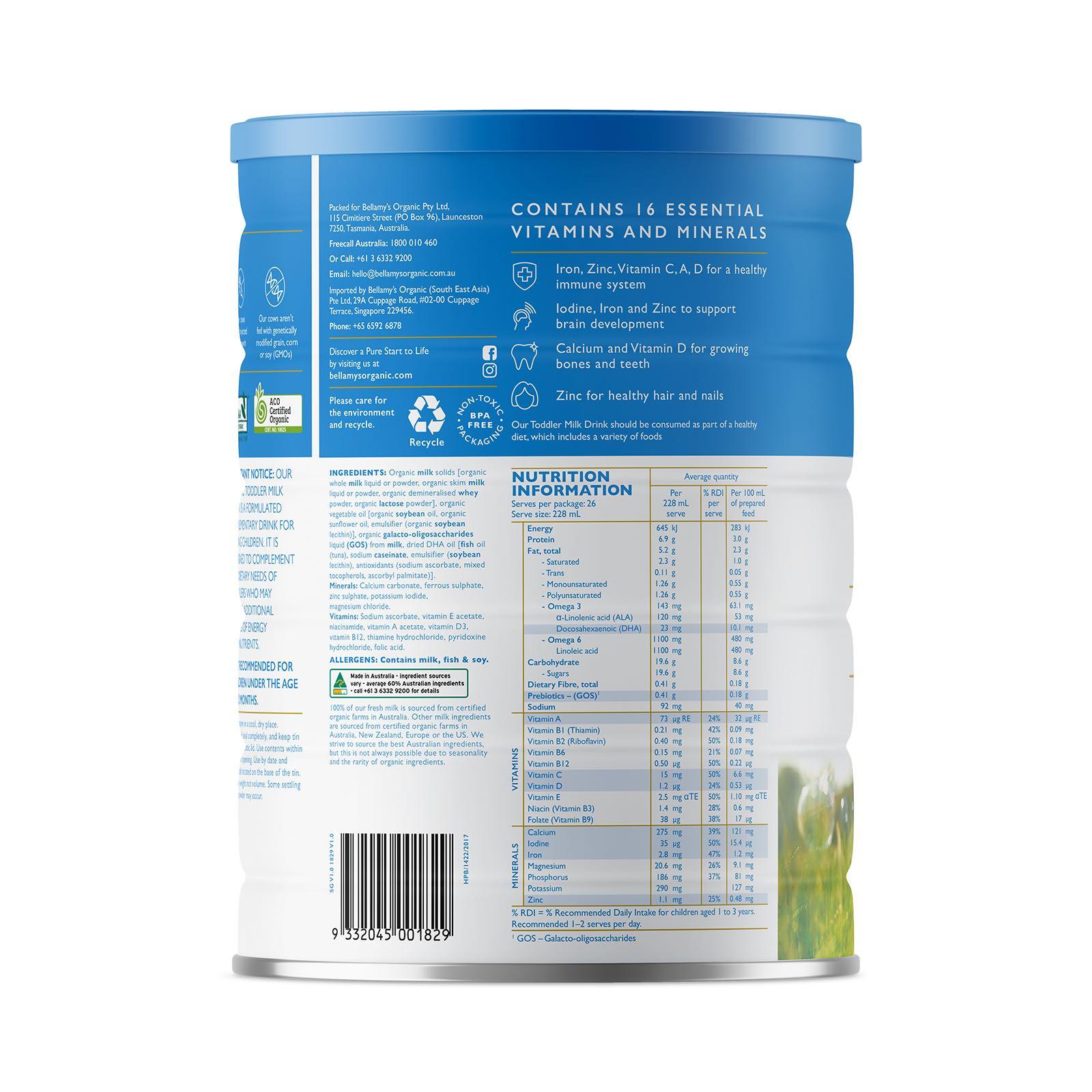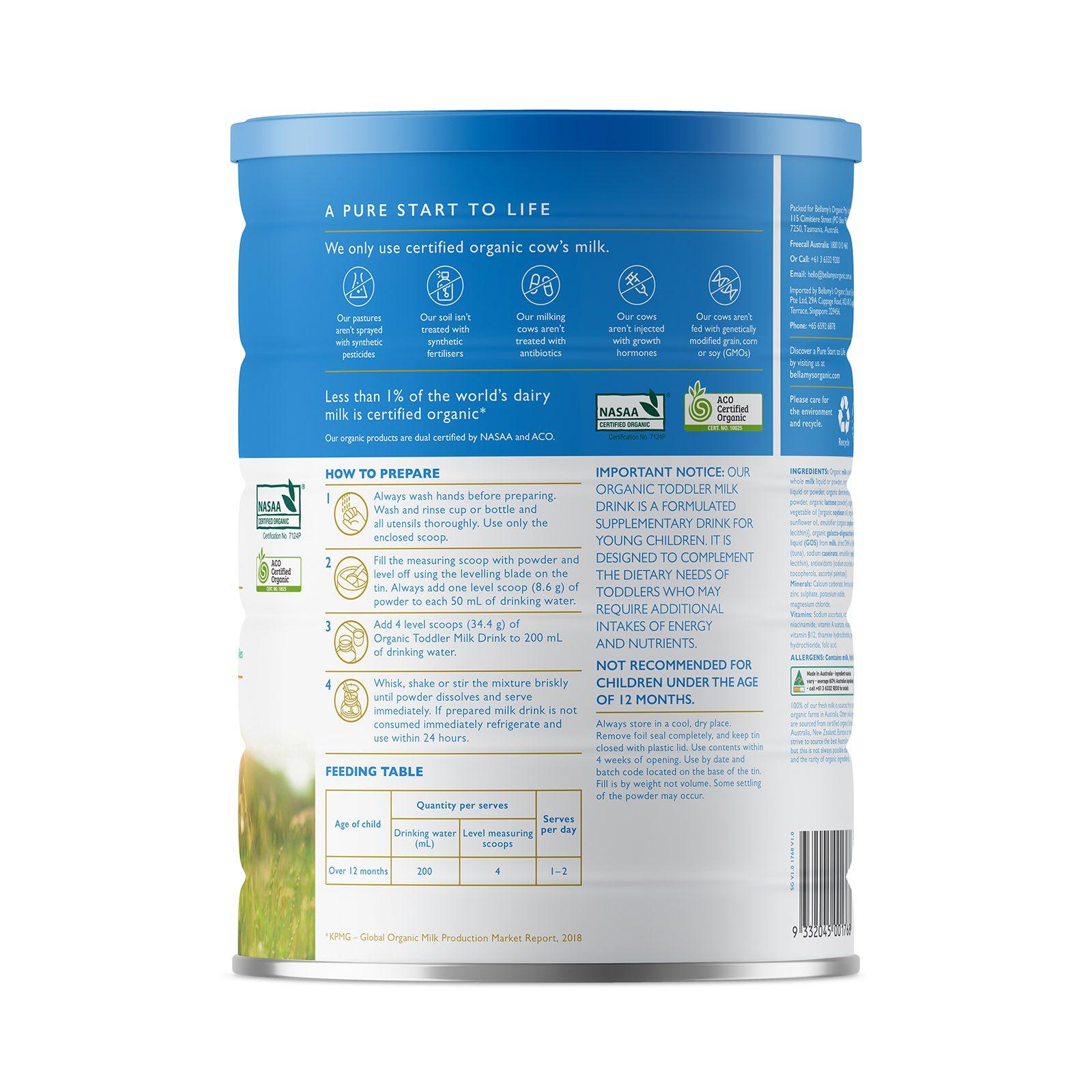 Bellamy’s Organic Step 3 Toddler Milk Drink is a premium formulated supplementary milk drink, carefully crafted to support active toddlers from 1 to 3 years of age, when dietary intake may be inadequate. An enriched alternative to ordinary cow’s milk, our Toddler Milk Drink is made from certified organic cow’s milk, with the addition of essential fatty acid DHA, prebiotic (GOS) and 16 essential vitamins and minerals. Added DHA & GOS Iron, Zinc, Vitamin C, A & D for a healthy immune system Iodine, Iron and Zinc to support brain development Calcium and Vitamin D for growing bones and teeth Zinc for healthy hair and nails Australian made Our Toddler Milk Drink tin will provide you with the necessary measuring scoop and preparation instructions, along with a feeding table to guide you on how much your toddler will need each day. Our Toddler Milk Drink should be consumed as part of a healthy diet, which includes a variety of foods.