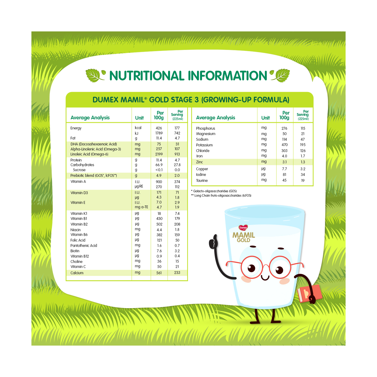 Add 5 level scoops (41.5g) of Dumex Mamil Gold Stage 3 Growing Up Formula to one glass (200ml) of boiled lukewarm (approx. 40 degree C) water. Stir well before drinking.1. Wash your hands thoroughly before preparing the feed.2. Wash, and then boil cleaned bottle, cap, teat or cup in clean drinking water for 10 minutes.3. Boil drinking water for 5 minutes, let it cool until 40 degree C.4. Pour correct amount of previously boiled lukewarm (40 degree C) water into the bottle.5. Add correct number of scoops, levelled off of Dumex Mamil Gold Stage 3.6. Cap bottle and shake bottle gently until the powder dissolves. Reminder- Discard unused feed.