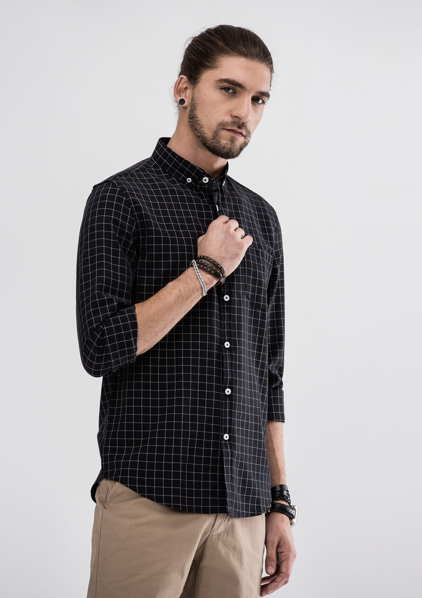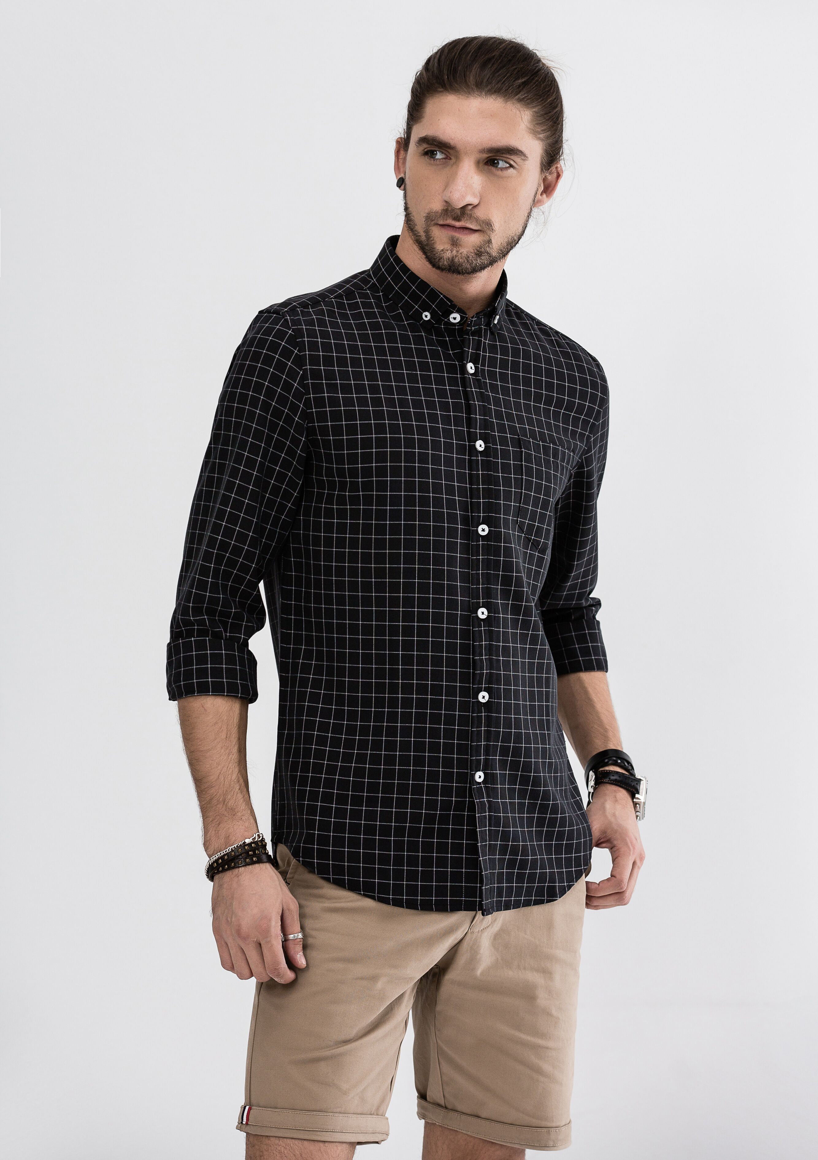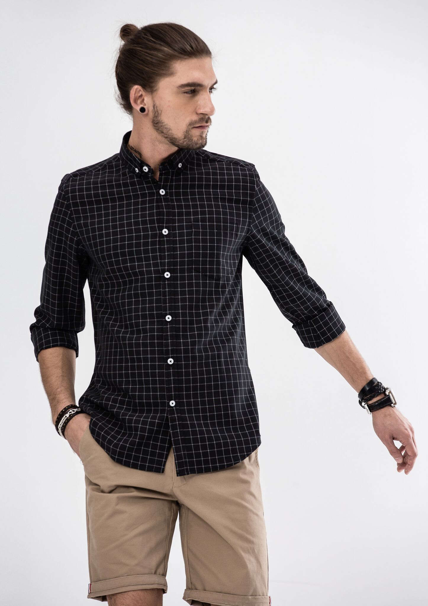 - Signature fit long sleeve shirt with button down band collar and sophisticated curved hem