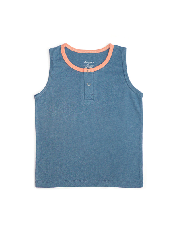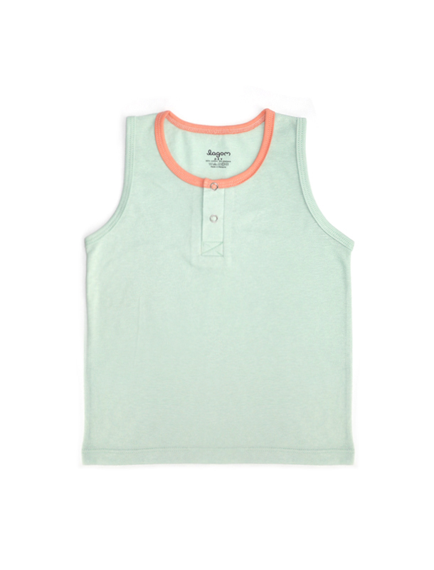 \r Happi Sleeveless Unisex Top by Lagom Kids is a basic everyday top with peach trimmings and snap buttons in the front for easy wearing. Available in Blue and Green colour. \r \r