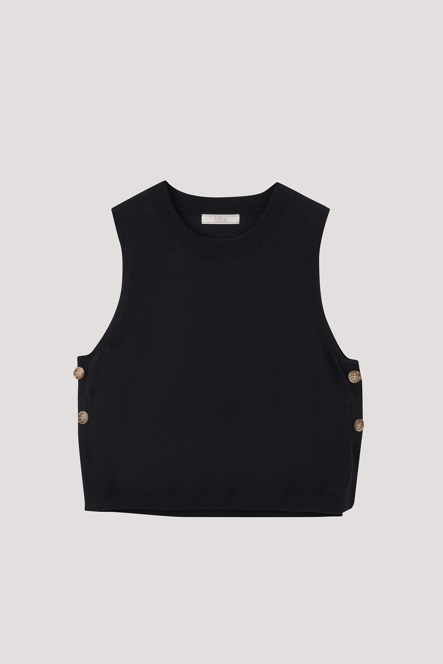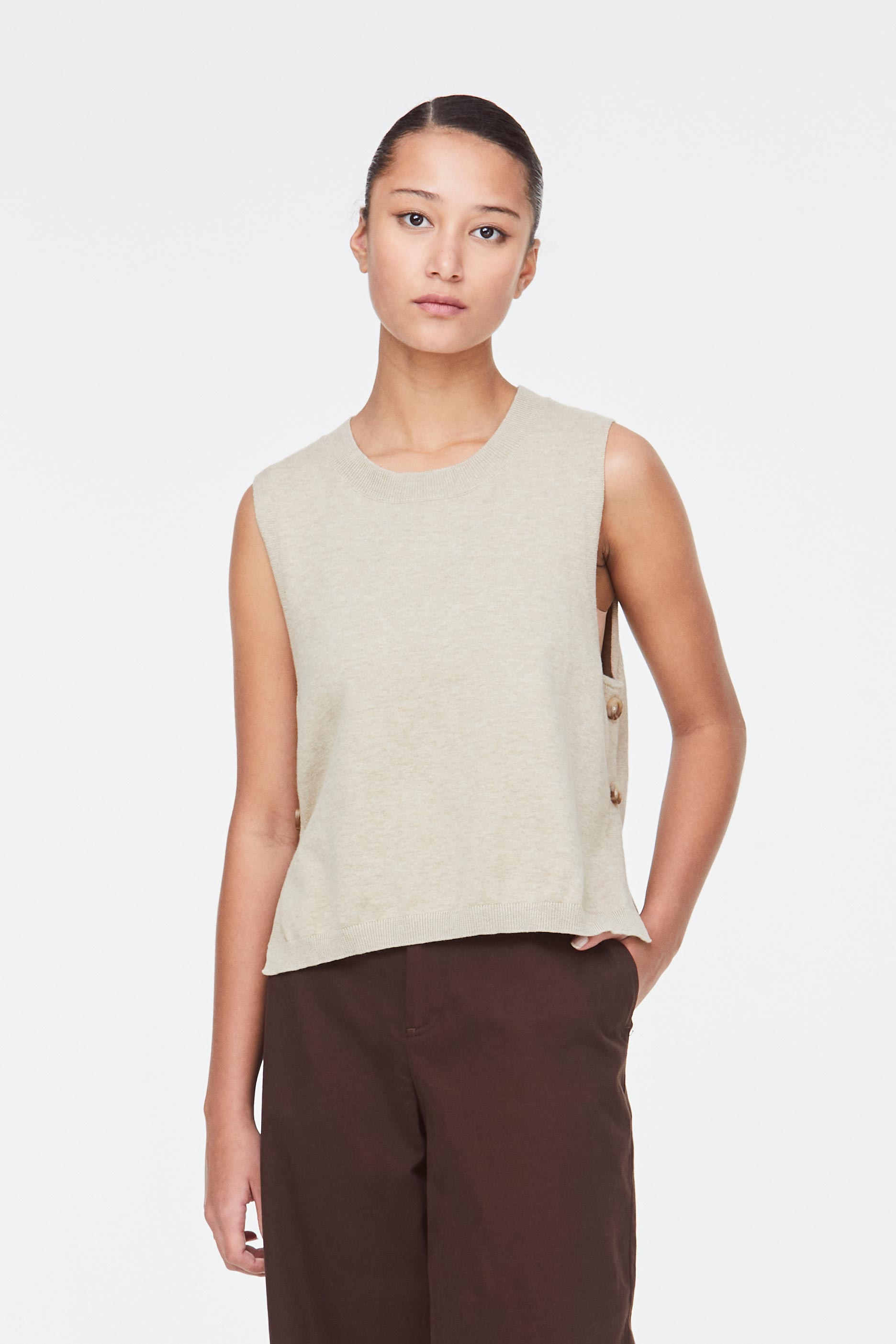 Tortoise shell button detail along sideseam