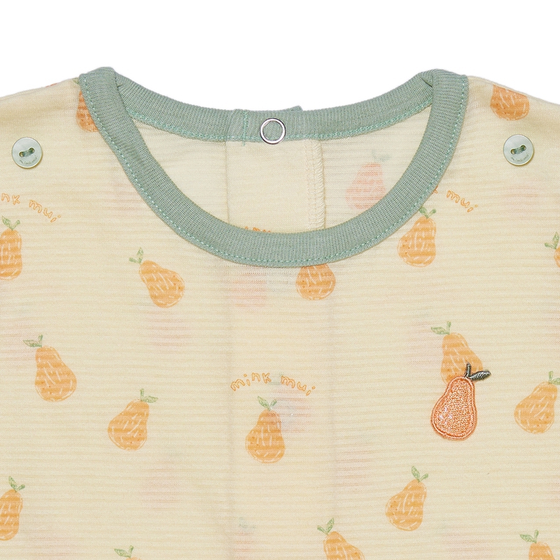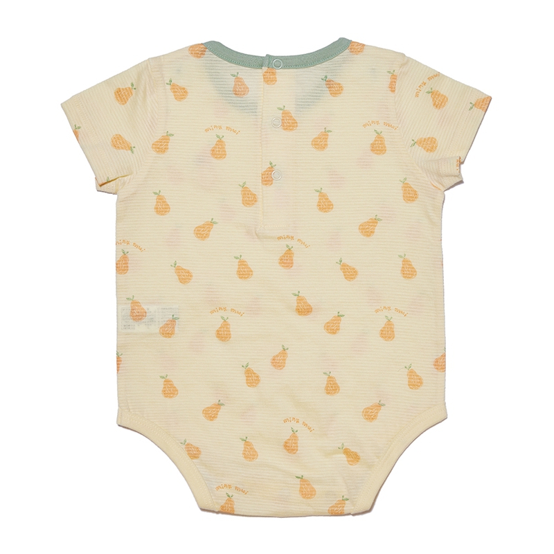This bodysuit set features a soft and lightweight jacquard fabric with a Western pear fruit pattern. The fine jacquard line increases breathability, providing babies with sensitive skin a light and cool fit. It comes as a set with a detachable bib and hat, making it a perfect gift option for babies.