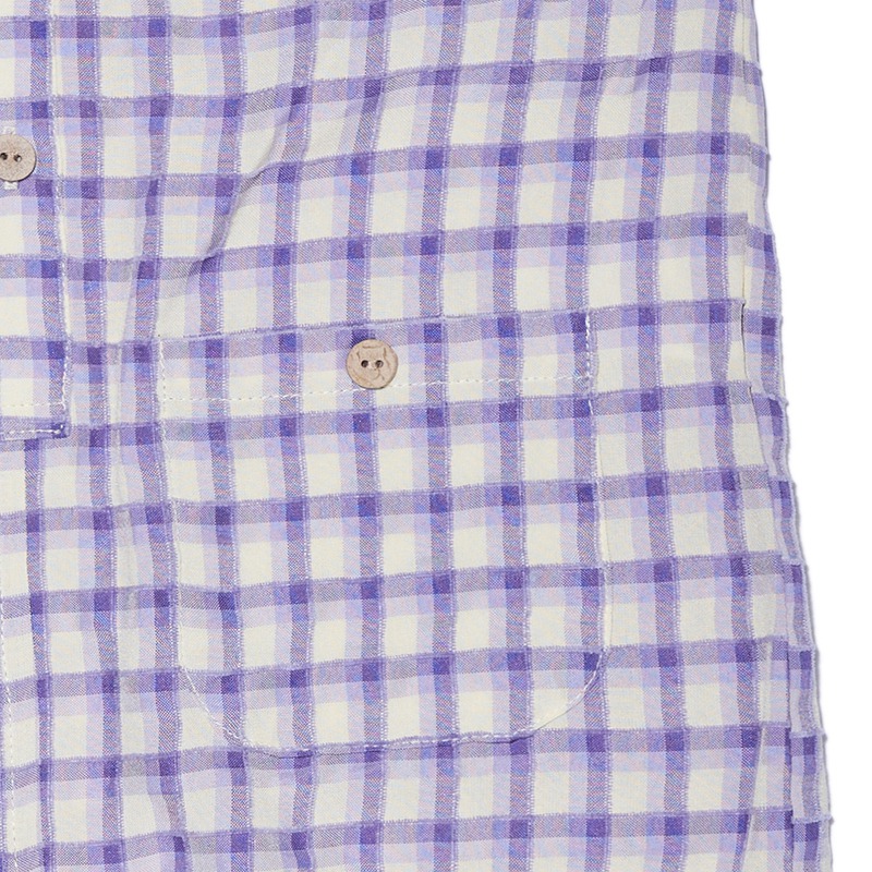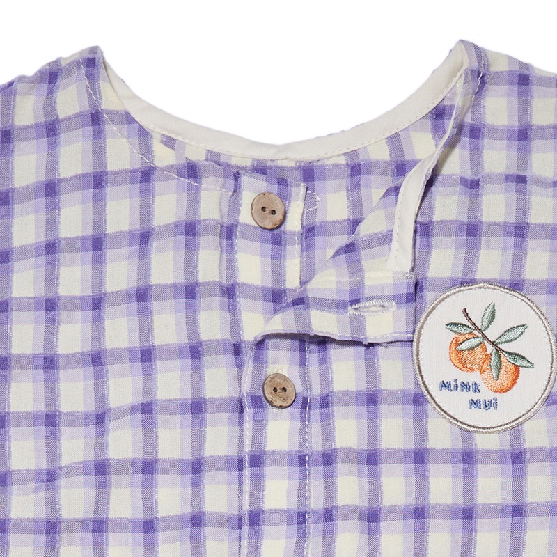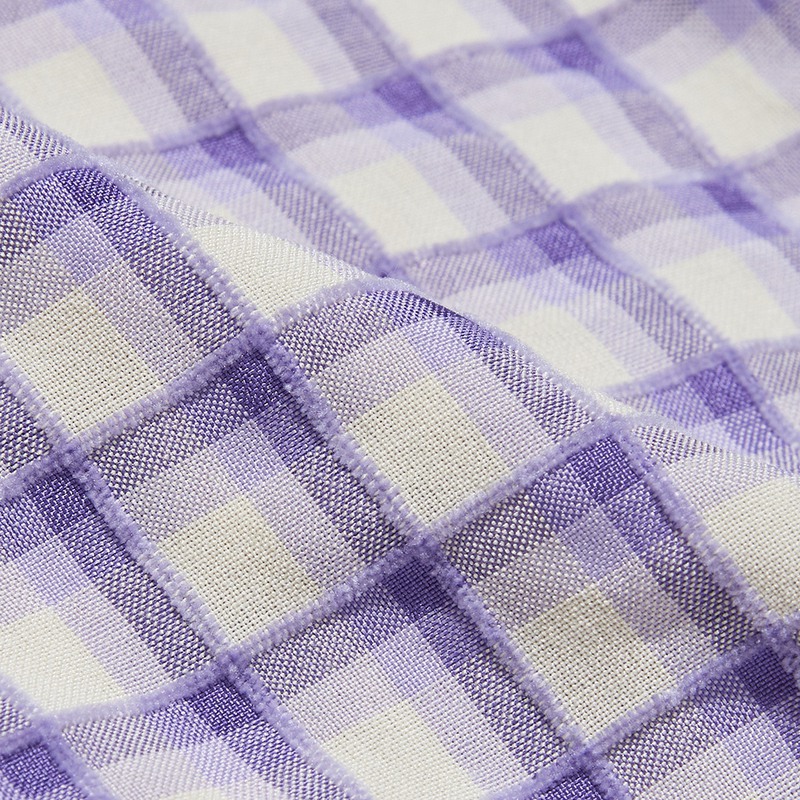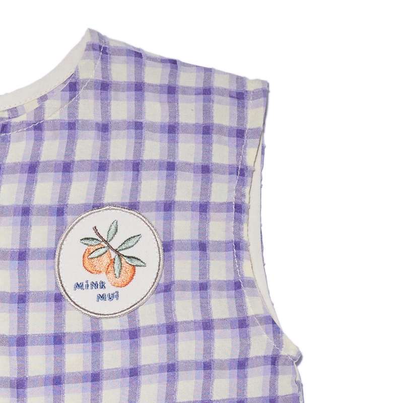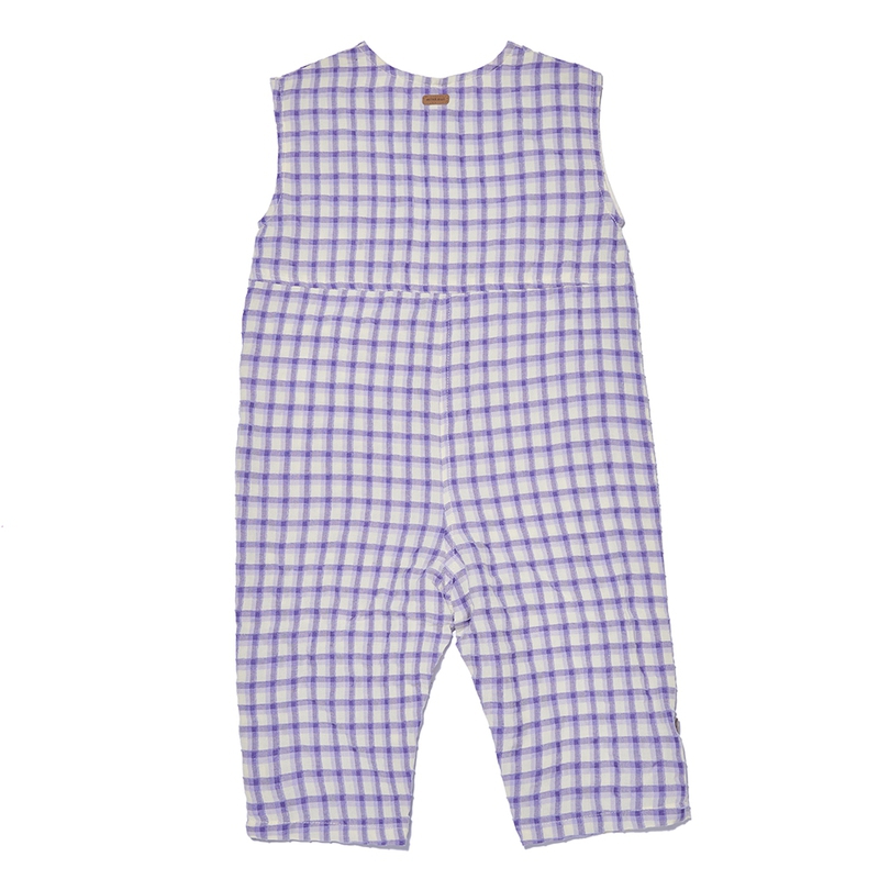 This is a lavender-colored check jumpsuit made of a cool and soft material. Its length can be adjusted by rolling up the bottom button, adding versatility to the piece. With its sleeveless design, it can be worn on its own for a stylish look or paired with a cardigan for a layered outfit.