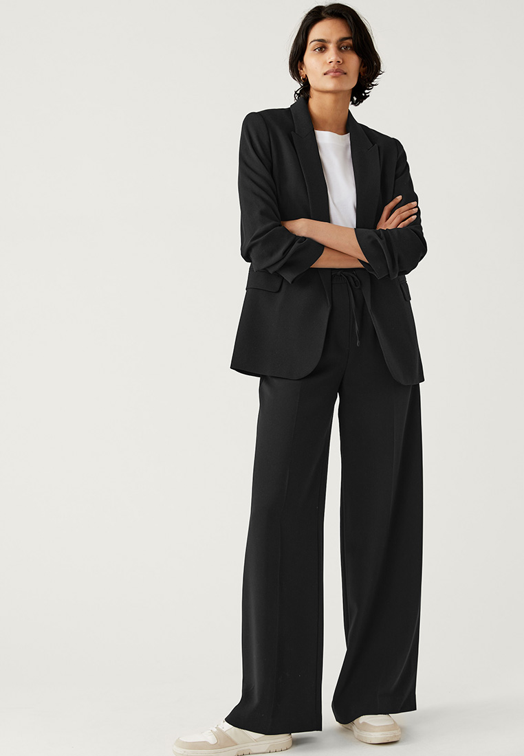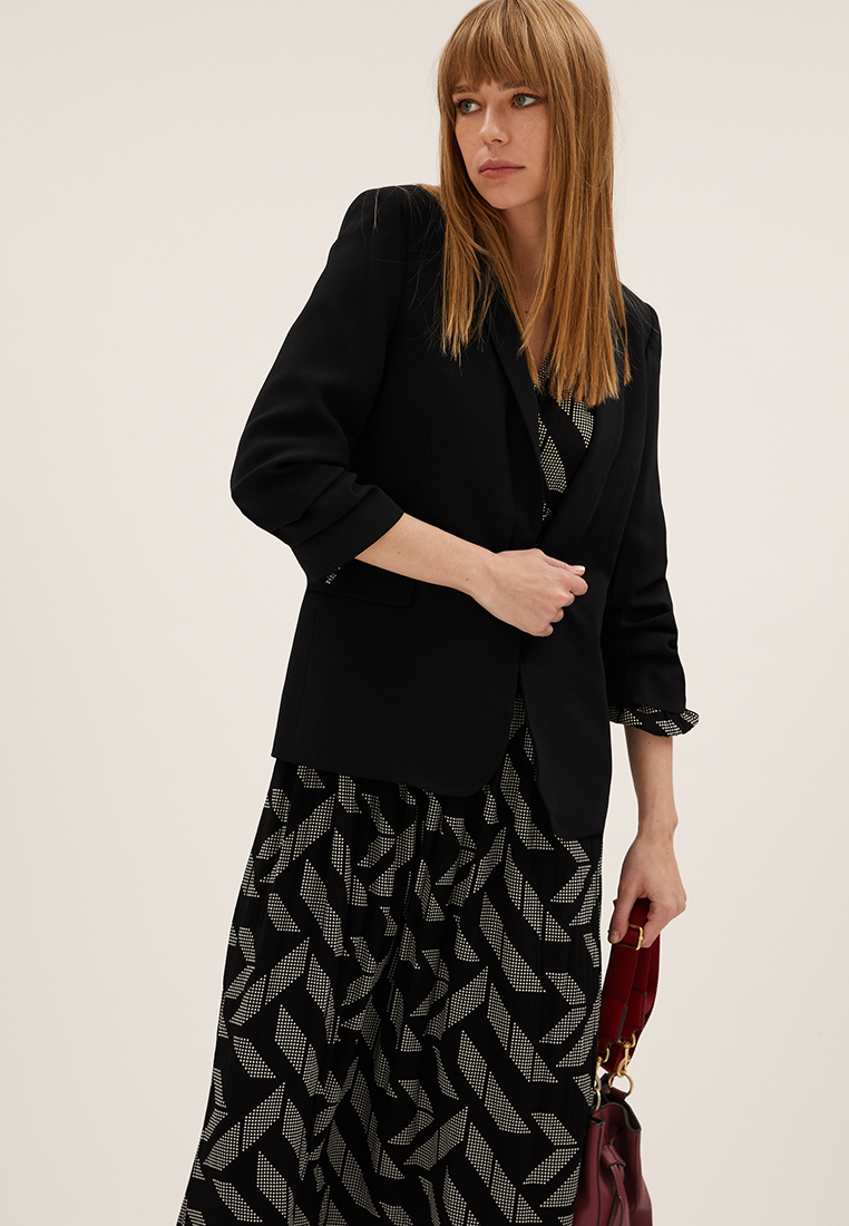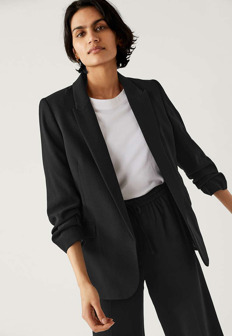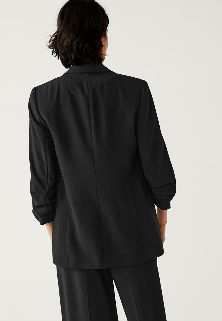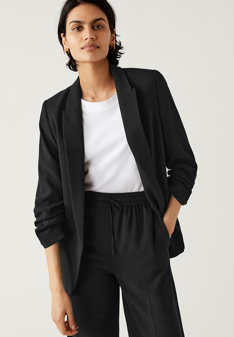 Throw on this easy-to-wear crepe blazer to instantly smarten up on casual days. Designed in a laid-back relaxed fit with 3/4 length ruched sleeves. Edge-to-edge design with no fastenings. Flap pockets and peaked lapels. Fully lined for comfort.Product Style: Relaxed fit; Lined; Fabric Source: Lapel shapeMaterial Composition: 100% polyester; Lining: 55% polyester; 45% viscose\r Care Instructions: Machine washable even at 30º