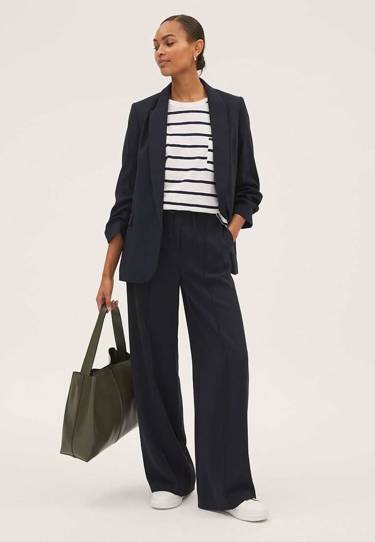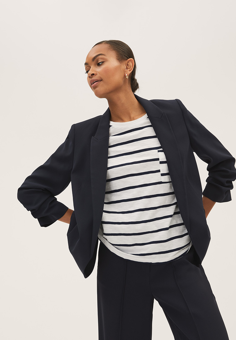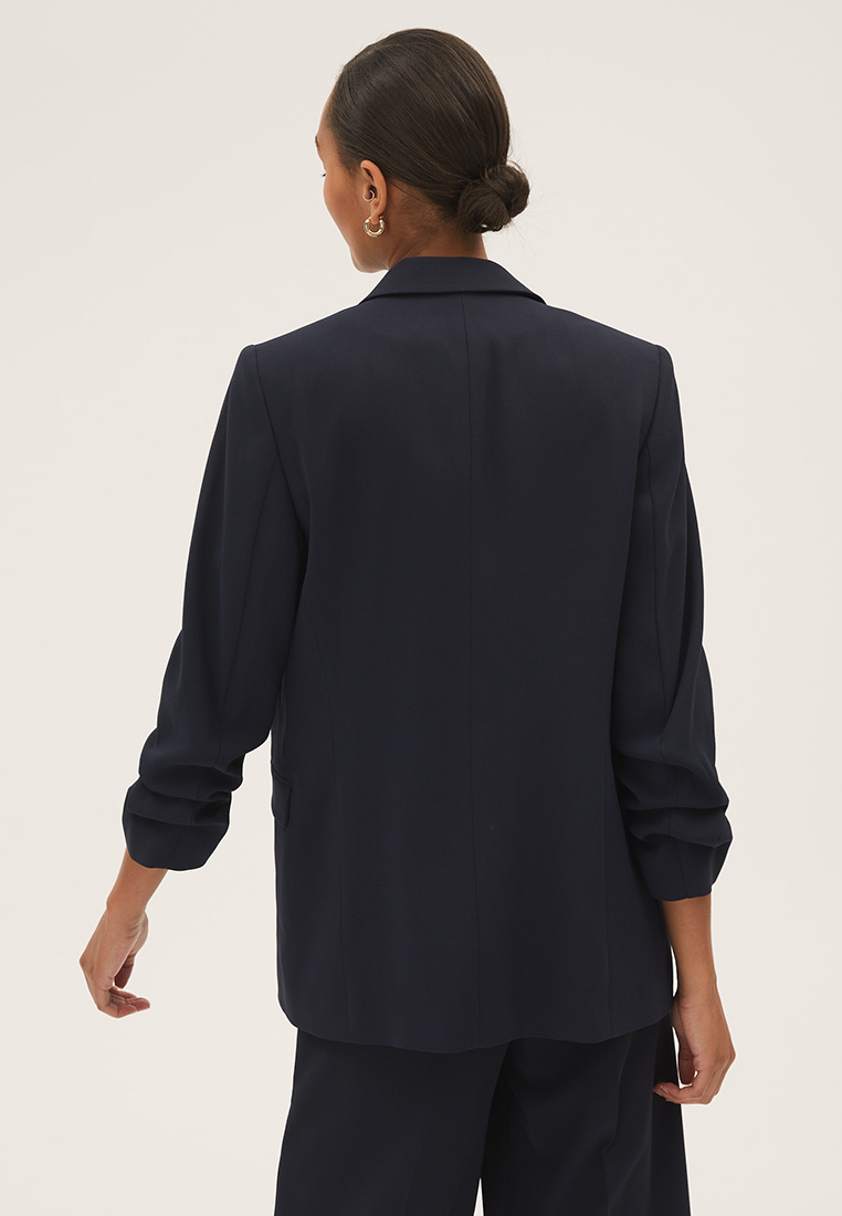 Throw on this easy-to-wear crepe blazer to instantly smarten up on casual days. Designed in a laid-back relaxed fit with 3/4 length ruched sleeves. Edge-to-edge design with no fastenings. Flap pockets and peaked lapels. Fully lined for comfort.Product Style: Relaxed fit, LinedMaterial Composition: 100% polyester, Lining - 55% polyester, 45% viscose, Care instructions: Machine washable even at 30°C