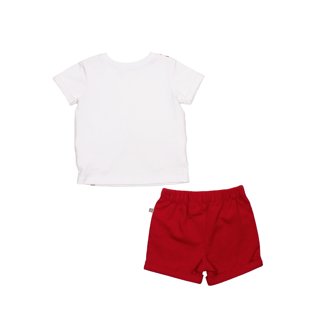 This 2 piece top and bottom set consists of crew neck tee with matching wide leg shorts. The faux vest adds a fun twist to the style and you little gentleman is ready to go!