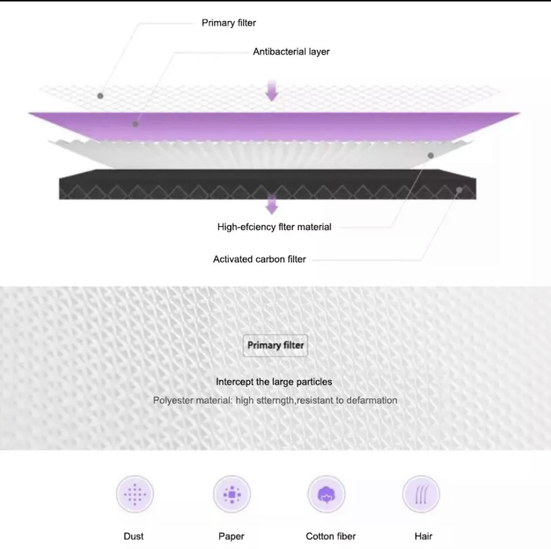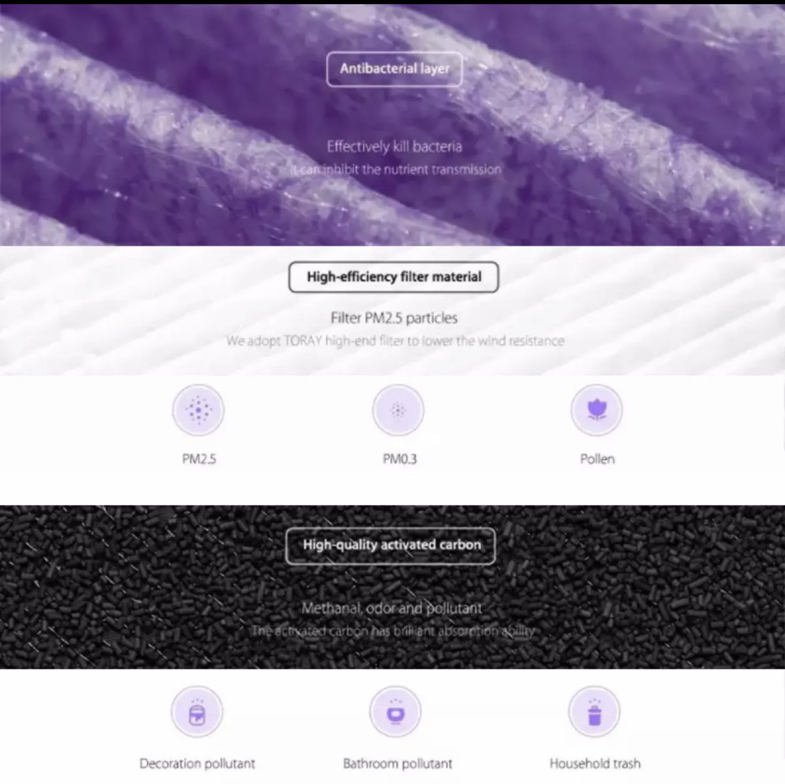 Effectively eliminates bacteria, dust mites, PM2.5 particles in the air