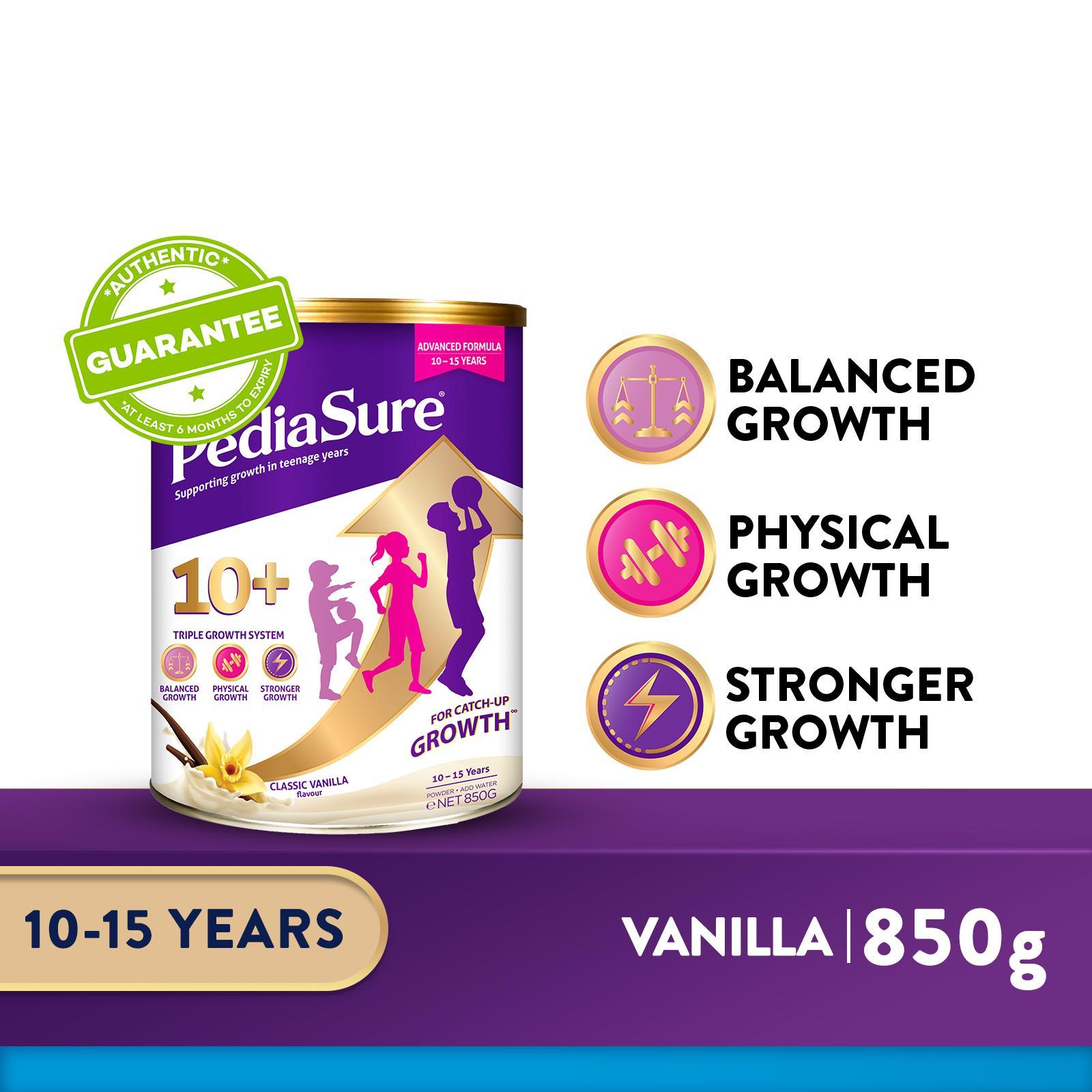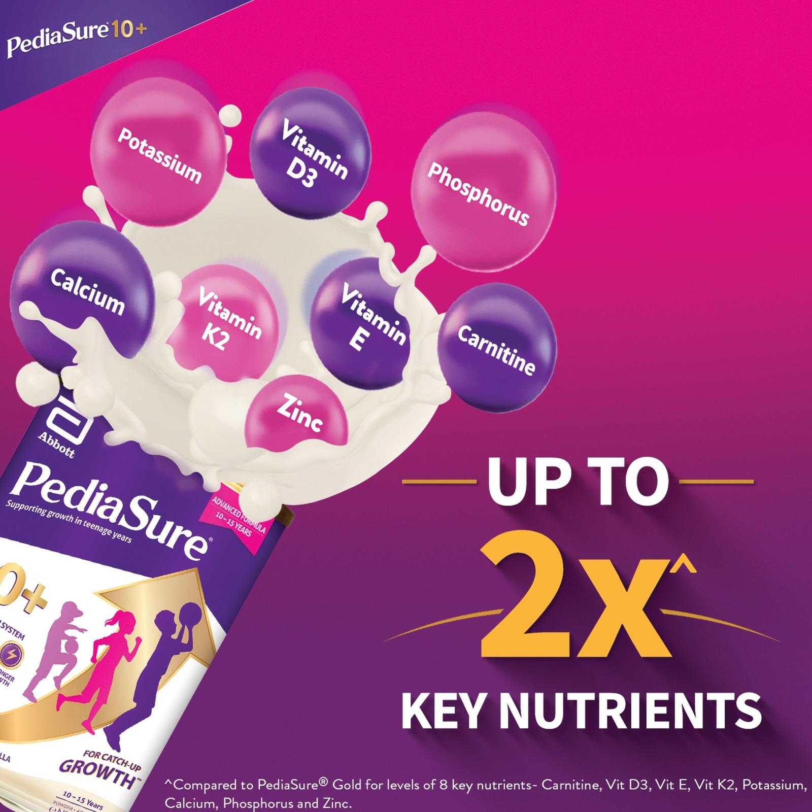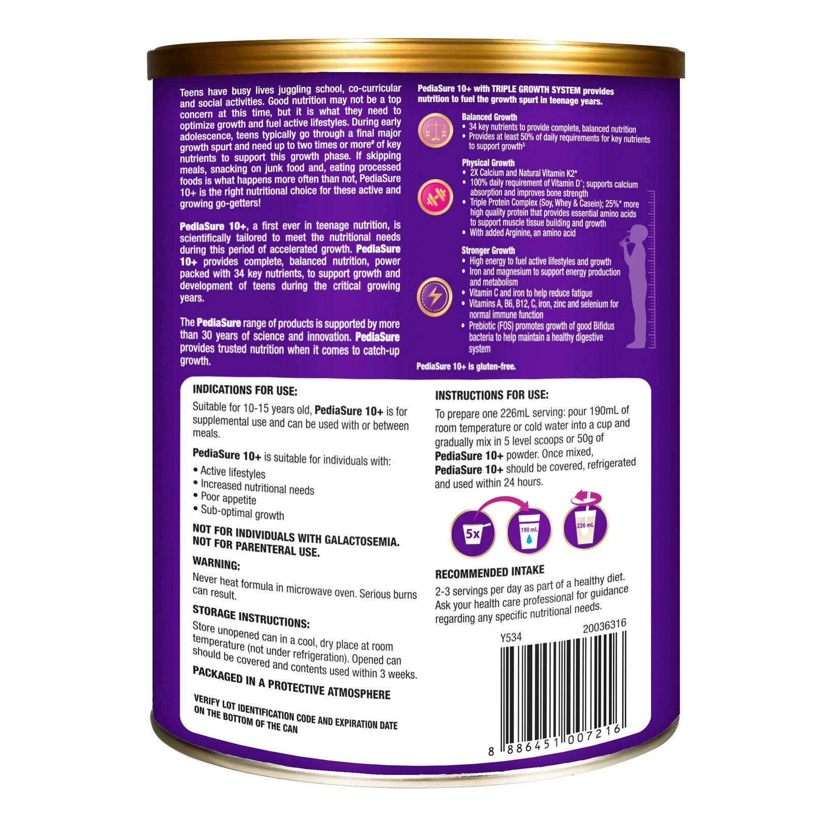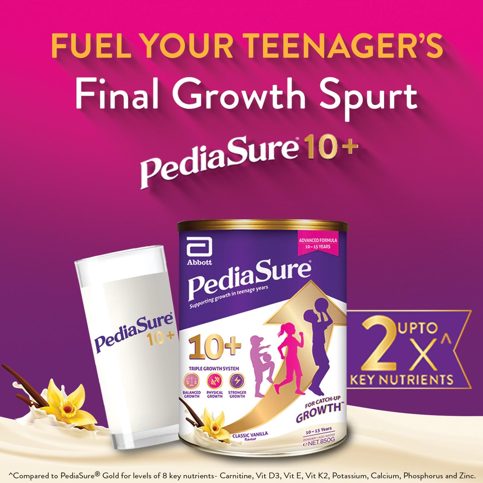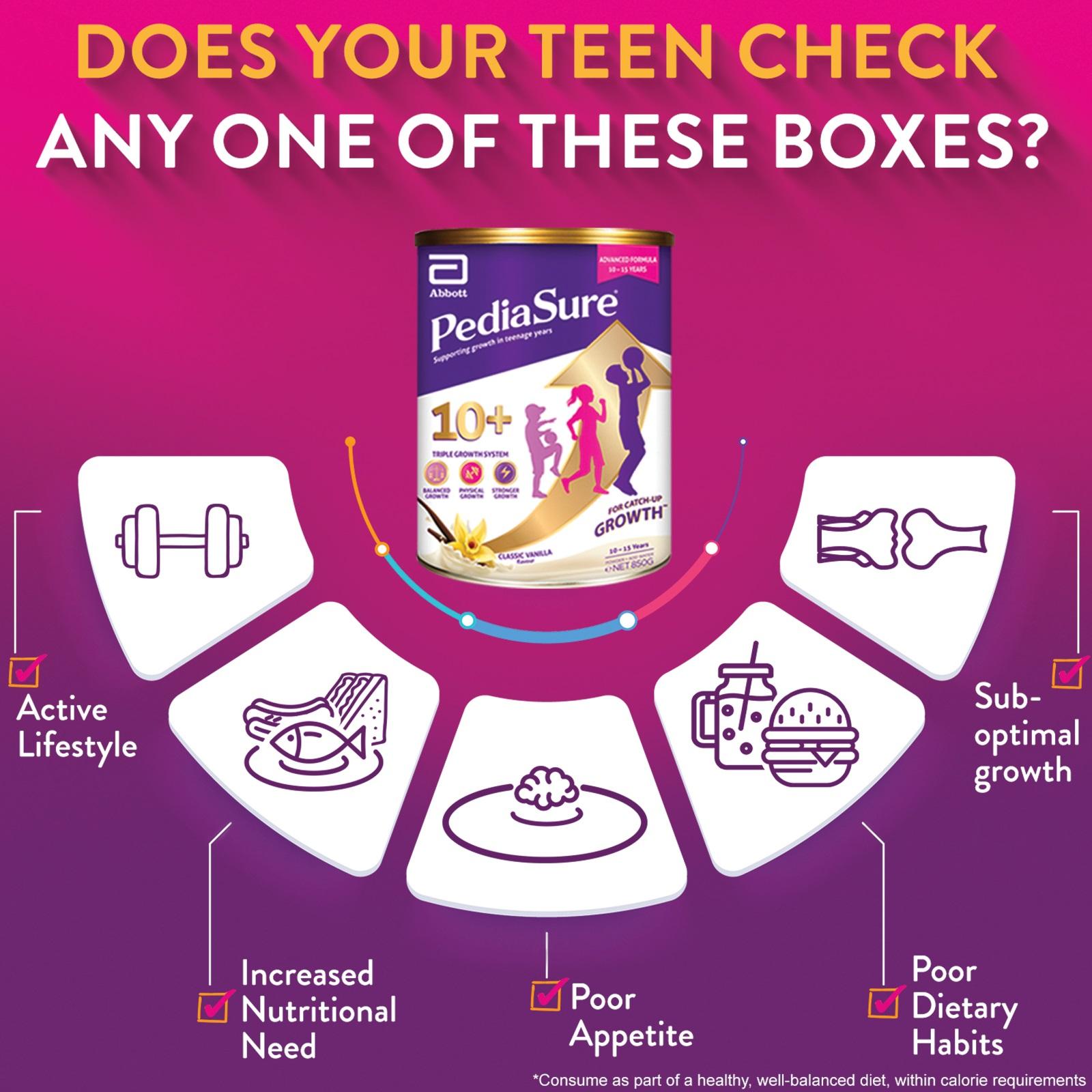 Fuel Teen's Final Growth Spurt with PediaSure 10+ - The Teen Growth Expert. PediaSure 10+ is specialized teen nutrition with the Triple Growth System and up to 2X^ key nutrients to help support increased nutritional needs of teens during their final growth spurt. Power-packed with 34 key nutrients and complete, balanced nutrition, PediaSure 10+ is your delicious, stress-free nutrition strategy to help fuel your Teen’s final growth spurt. Suitable for Teens with -Active lifestyle -Increased Nutritional Need -Poor Appetite -Poor Dietary Habits -Sub-optimal growth.